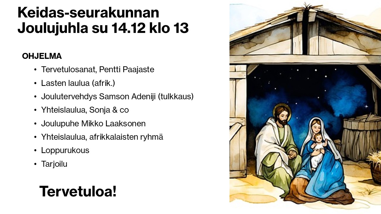 Keidas-seurakunta on olemassa siksi, että olemme löytäneet Jeesuksen Kristuksen Vapahtajana ja haluamme viedä tätä ilosanomaa eteenpäin Vaasassa ja Pohjanmaalla sekä koko Suomessa ja lähetyskentillä.